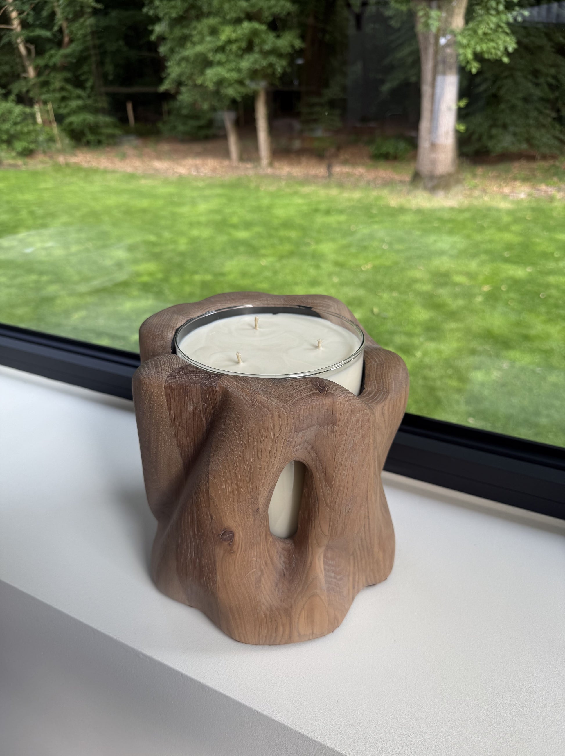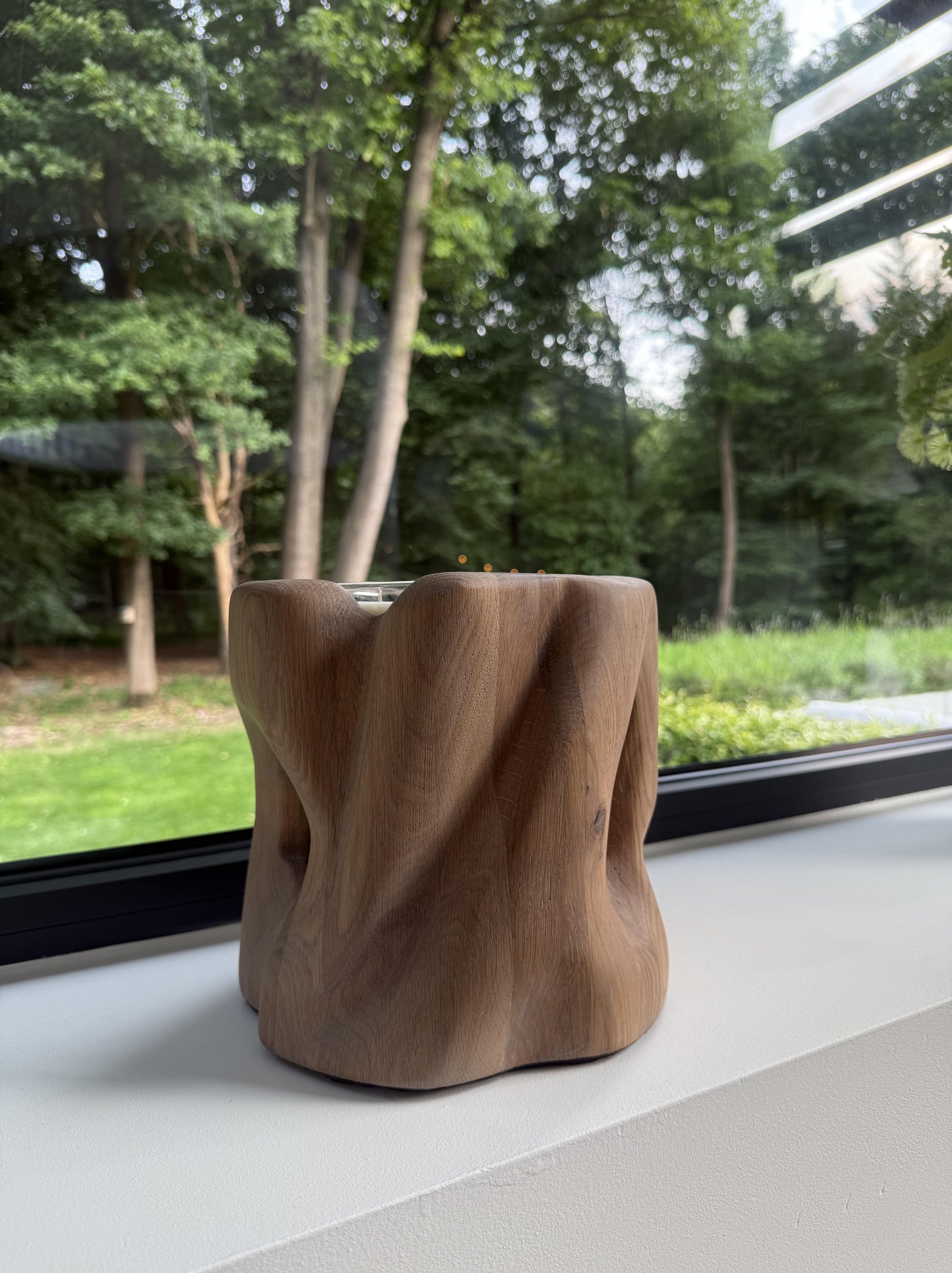 This is a sculpted candle made from solid 4cm tink oak. It is sculpted in a way that highlights the travel of the candle inside. The candle is made from plant based soy wax and does not leave black marks on your walls. The scent of this candle is leather but can be customised by special order.